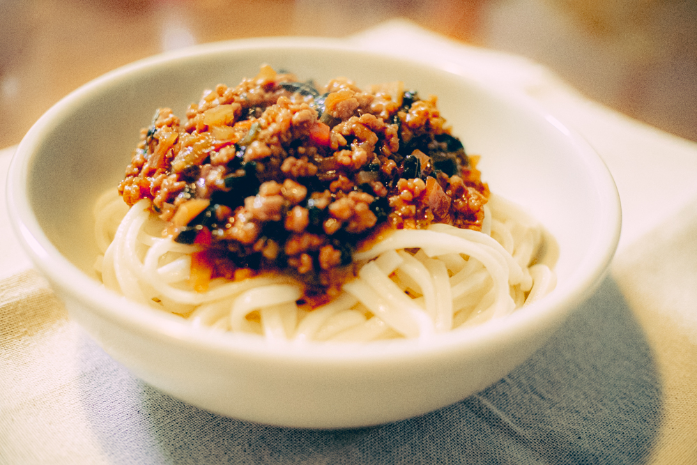 Thème : Dandan Udon au poulet - grosses nouilles japonaises avec poulet hâché assaisonné au miso relevé