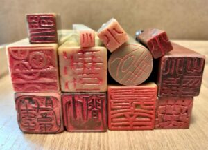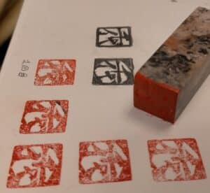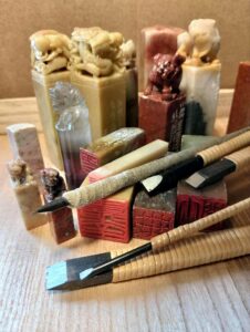 篆刻とは主に篆書と呼ばれる文字を石や動物の角、木に彫って印にする中国からやって来たアートです。篆書は一番古い漢字です。画家や書家の名前、言葉、もしくは絵や紋章などを、印刀で彫ります。主に芸術作品にサインをする時に使い、この印の事を落款と呼びます。