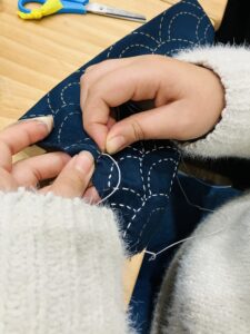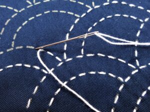 Le Sashiko est une broderie traditionnelle japonaise inspirée de la récupération de textiles usagés. À l'origine, elle se pratique sur du tissu indigo, avec un fil spécifique blanc. Le Sashiko servait en fait à matelasser des tissus pour renforcer leur solidité, et obtenir ainsi des vêtements plus chauds. Les motifs sont simples, souvent géométriques et brodés au point avant. Dans cet atelier, le Sashiko sera réalisé sur une pièce de tissu indigo avec un motif traditionnel Seigaiha (vague).