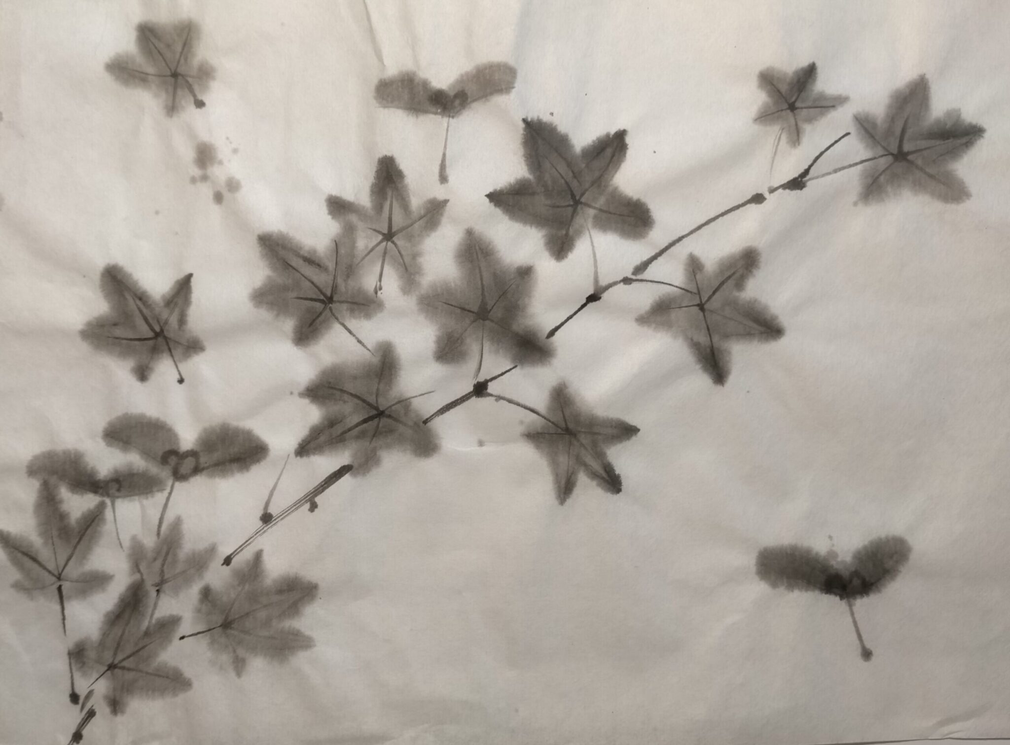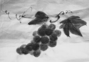 「墨に五彩あり」と言うように、墨の濃淡、ぼかし、 擦れなどを使い、黒墨のみで様々な色を表現します。 墨絵においては輪郭などの線描きがなく、これらの技巧により濃淡やボリューム、凹凸をつけることで、モチーフの形を描きます。