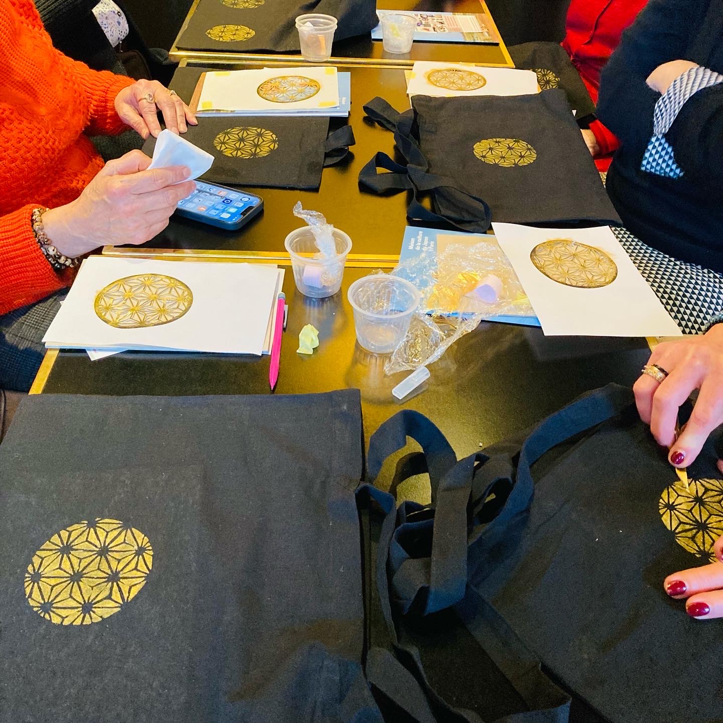 Ensuite, le motif sera teint sur un eco-bag (fourni par Espace Japon) à l'aide du pochoir et de la pâte colorée pour textile.
