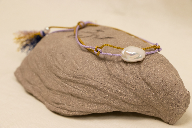 Bracelet composé d'une perle d'eau douce enfilée sur deux cordons en soie japonaise.