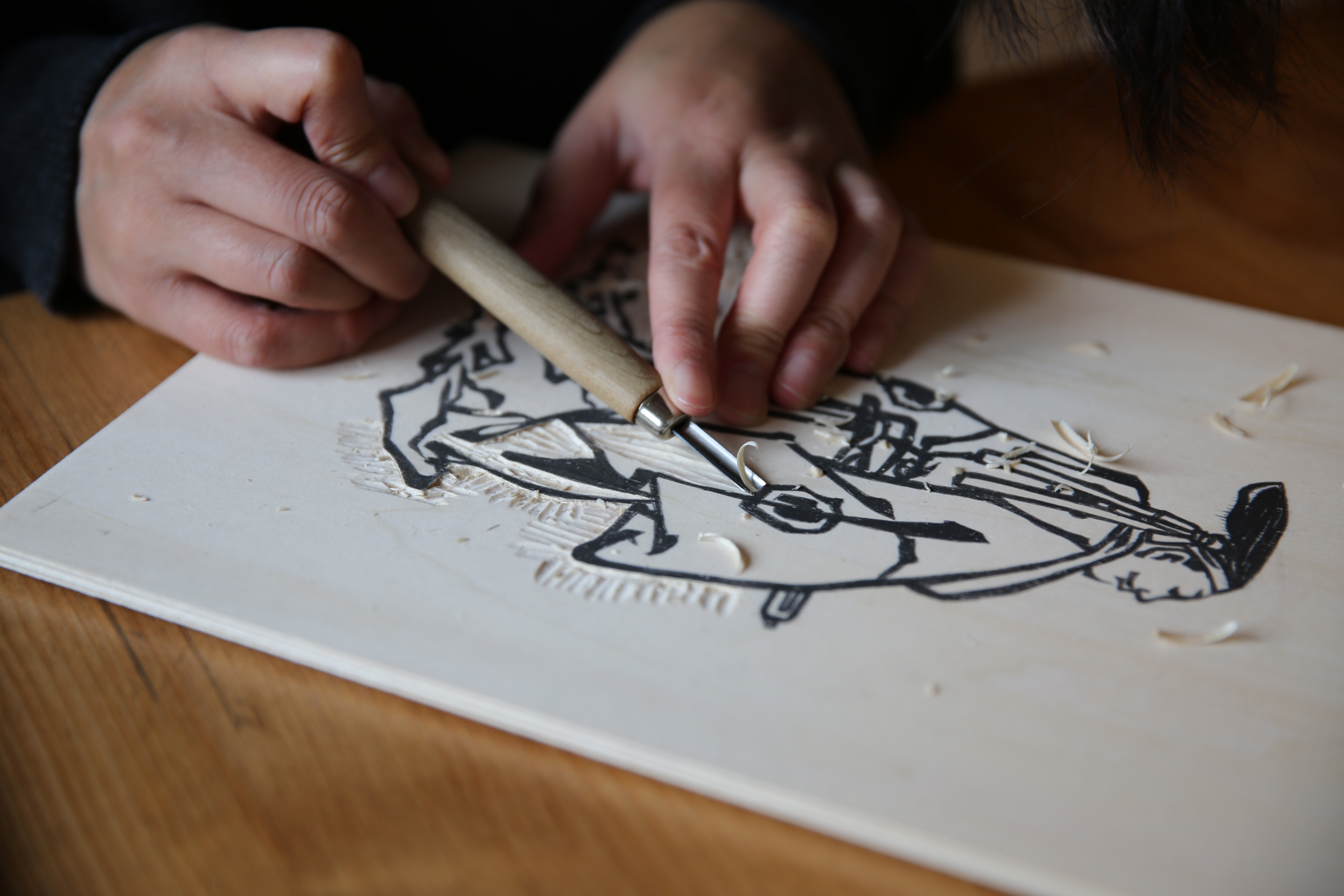 Gravure sur bois avec motifs japonais imprimés à l'encre de chine, utilisant la technique de la peinture traditionnelle japonaise.