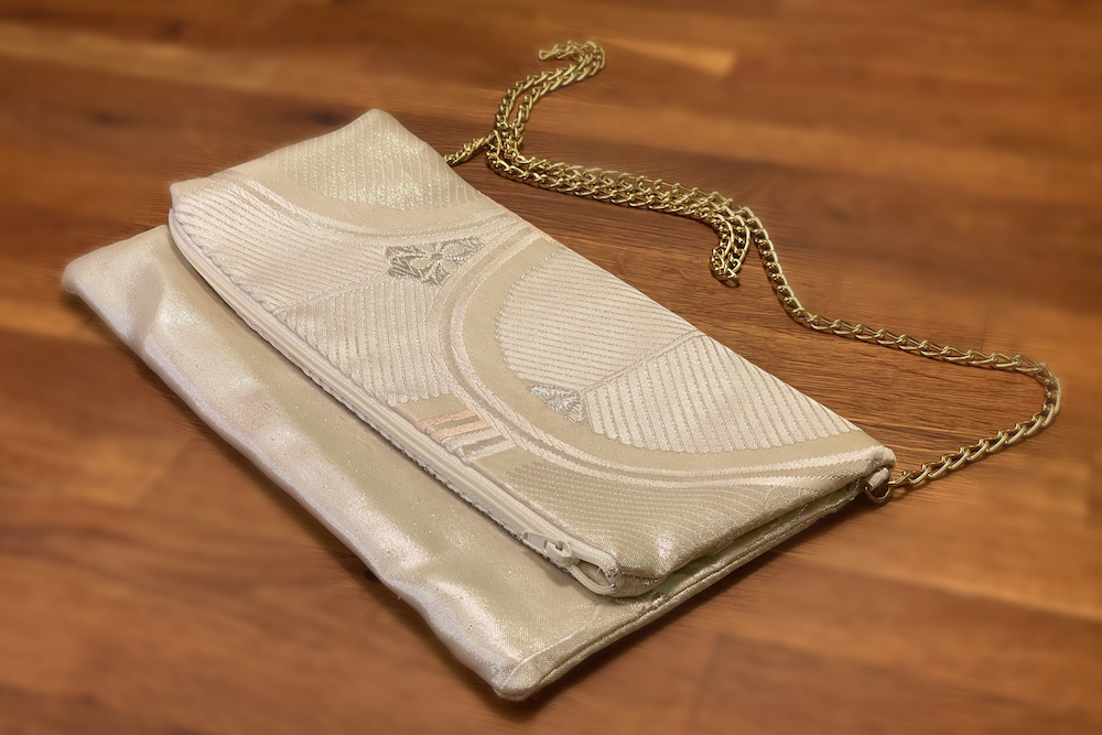 Comme toutes les créations d'Odile Van Den Woldenberg, cette pochette de soirée est fabriquée à partir d’anciens tissus japonais.