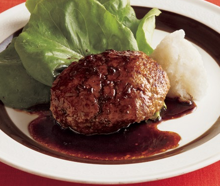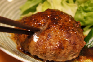 Hanbâgu (=hanbourg : steak haché juteux à la japonaise*) et salade de légumes de saison au wasabi