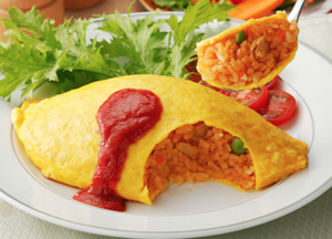 - Omuraisu (omelette+rice : omelette baveuse farcie de riz)
