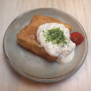 Protéine de soja frit, façon poulet frit à la japonaise / Sauce tartare à base de tôfu / Maki gros de légumes + alfalfa / Flan au matcha avec crème de tôfu
