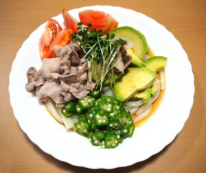 Thème : Buta-syabu Udon - grosses nouilles japonaises avec porc émincé, prune salée et bouillon froid*