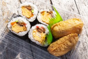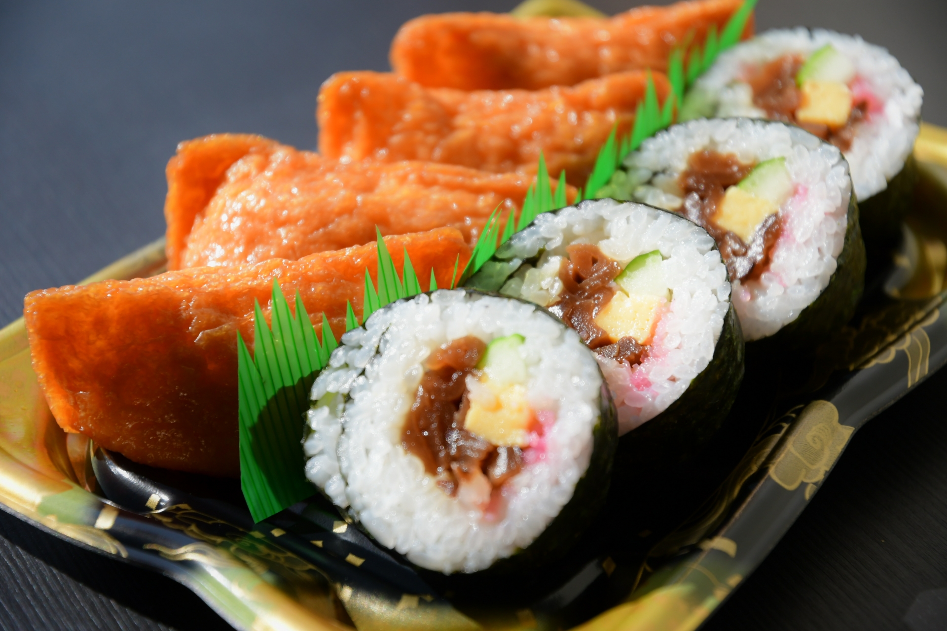 Et le Inari est le riz assaisonné dans une poche de tofu frit imbibé de la sauce soja sucrée.