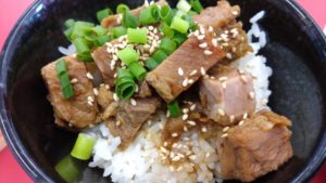 Menu : GYÔZA grillé (raviolis japonais) au porc* et Châshû-don (porc mijoté sur le riz)*