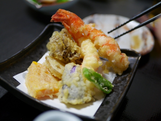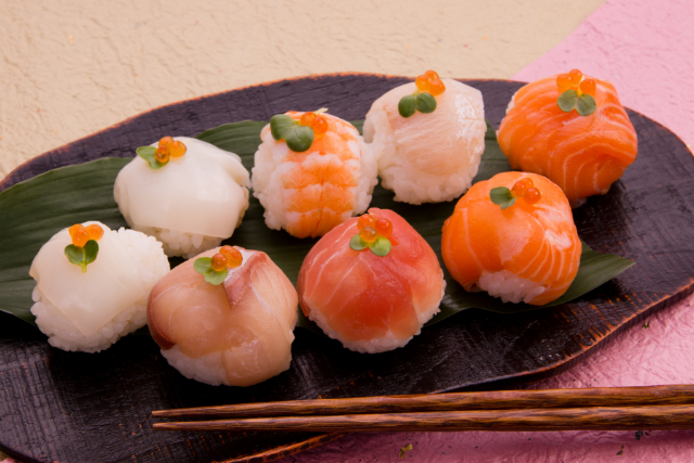 Menu : Temari-Sushi (aux saumon, crevettes et légumes) et tempura (beignet japonais)