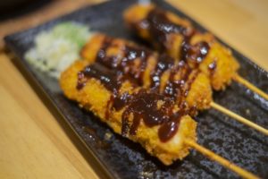 - Brochettes panées (crevette et racine de lotus) à la sauce de MISO à l'ail