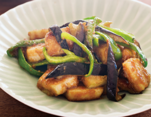 Plat contemporain sur le sujet de mariage de miso et d'aubergine : Aubergine sautée avec poulet au MISO