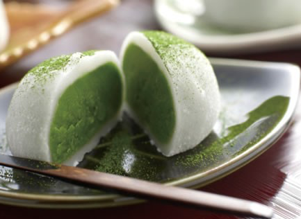 Pâtisserie du jour: Matcha daifuku (pâte de haricots rouges parfumée au matcha enrobée de pâte de riz) et gâteau « Week-end » au Yuzu, agrume japonais à la délicate acidité.