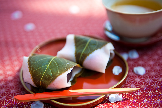 Pâtisserie du jour : Sakura mochi (mochi à la feuille de cerisier) façon chômeiji et angel cake au matcha.