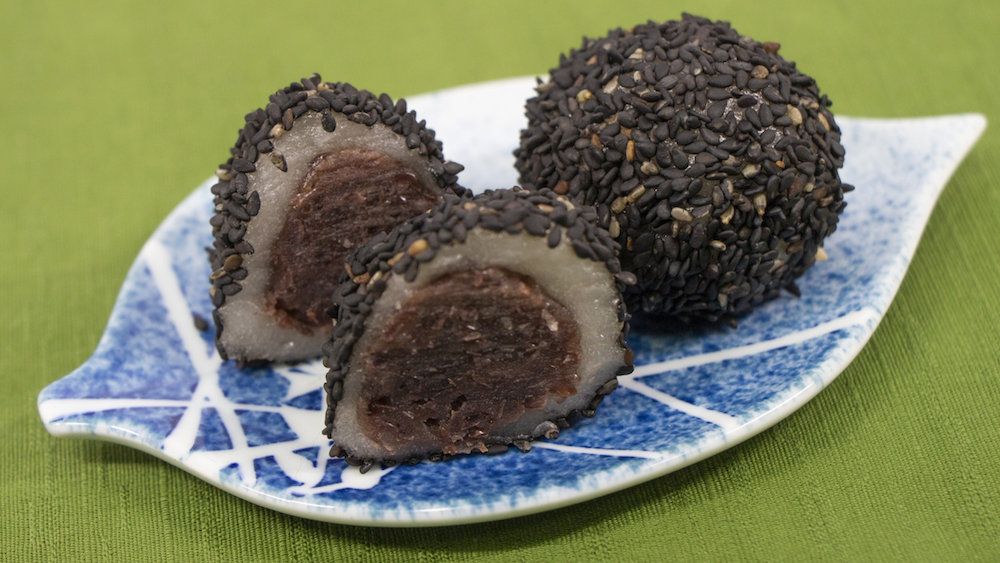 Pâtisserie du jour : Goma daifuku (mochi au sésames noirs garni de pâte des haricots rouges) et Angel cake au Yuzu.