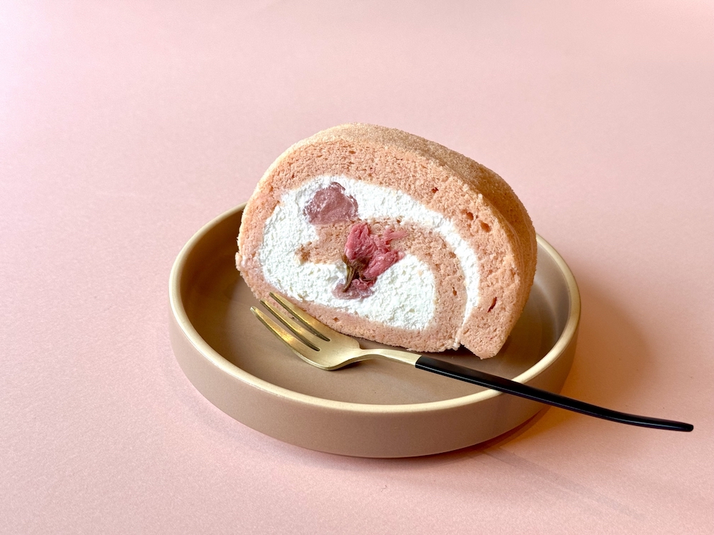Pâtisserie du jour : sakura roll-cake (à la fleur de cerisier)/ daifuku (mochi garni de la pâte de haricots rouges) à la pistache