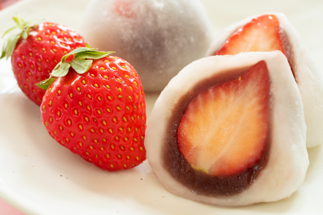 Pâtisserie du jour : Ichigo daifuku (mochi garni d'une fraise et de pâte des haricots rouges) et cheesecake à la japonaise.