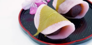 Pâtisserie du jour : sakura mochi façon Chômeiji (crêpe garni de pâte de haricots rouges enrobée d’une feuille de cerisier) / chiffon cake aux sésames noirs