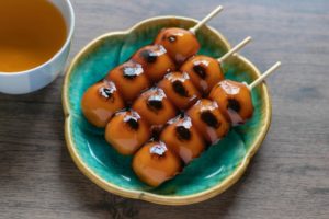 Nous allons également réaliser le Mitarashi-Dango, ce sont des brochettes de petites perles de mochi enrobées de sauce caramélisée à base de sauce soja et de sucre.