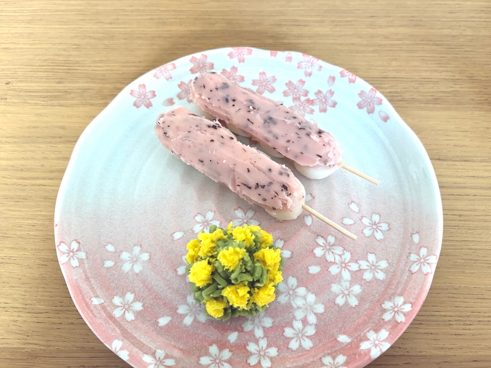 桜団子と菜の花きんとん。出来たての和菓子をお抹茶とともにご賞味ください。