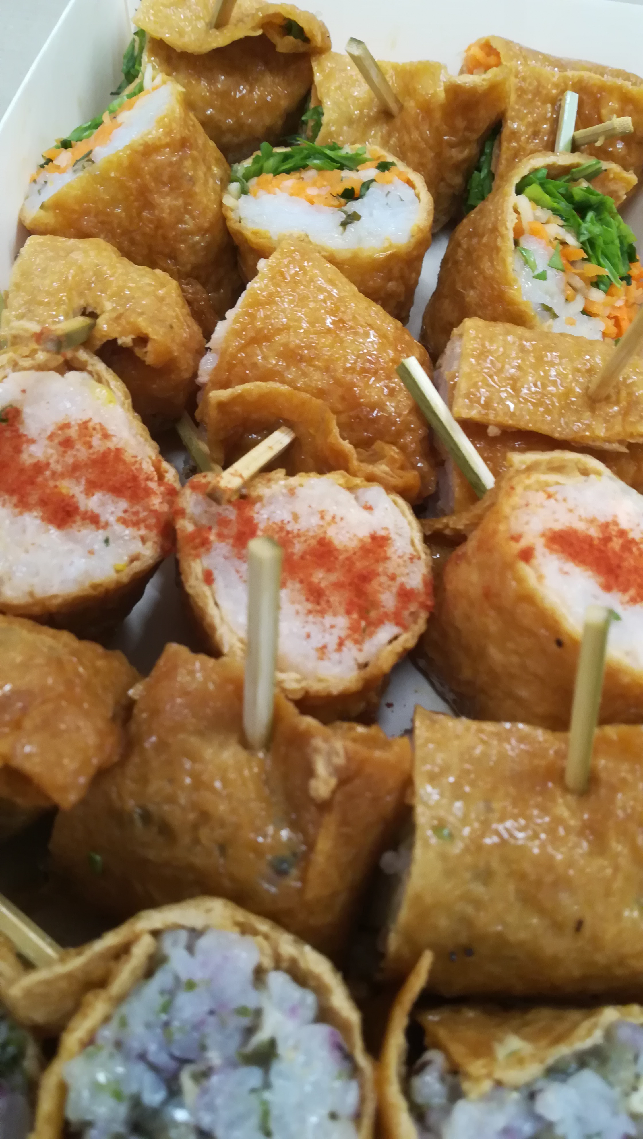 Inari (tôfu frit et baigné en sauce sucrée) au salsifis grillé / Sushi de carotte aux édamamé à la vapeur / Sushi poêlé aux racine de lotus