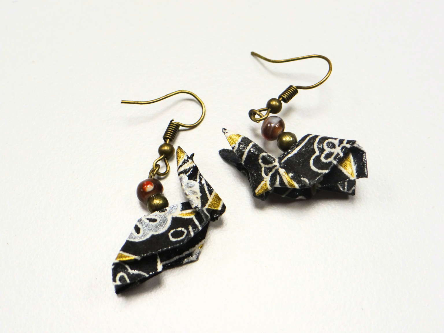 Bijoux originaux et fait main avec du washi (papier fabriqué artisanalement au Japon ), un crochet en métal doré (garanti sans nickel et sans plomb) et des Tombo-dama (perle en verre du Japon).