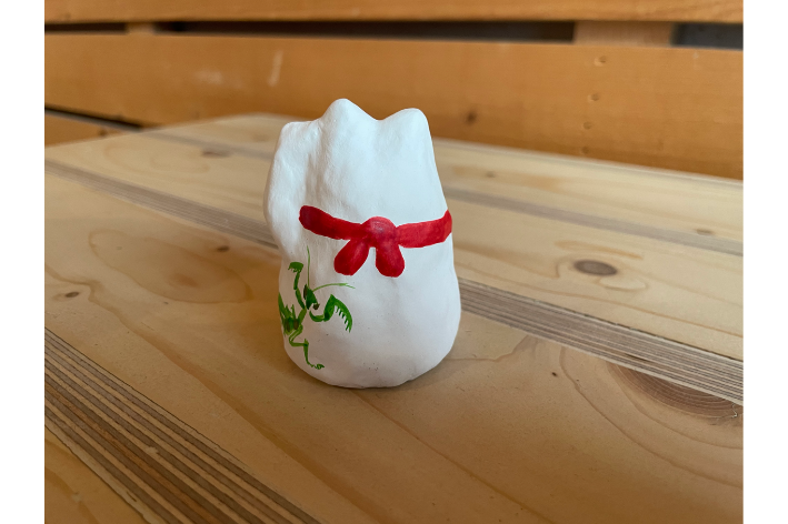 La figurine MANEKINEKO-Kamakiri représente un « chat qui invite » (maneki neko), une figure très populaire et bien connue, même en occident, qui attire la bonne fortune où qu’il soit positionner. Sur ce maneki neko est dessinée une mante religieuse (kamakiri), symbole de courage et d’intrépidité !