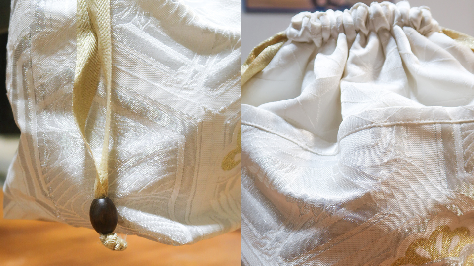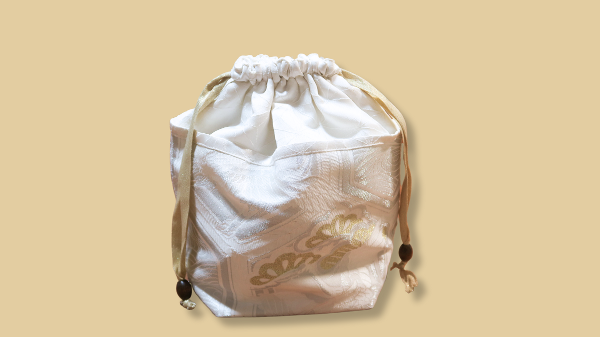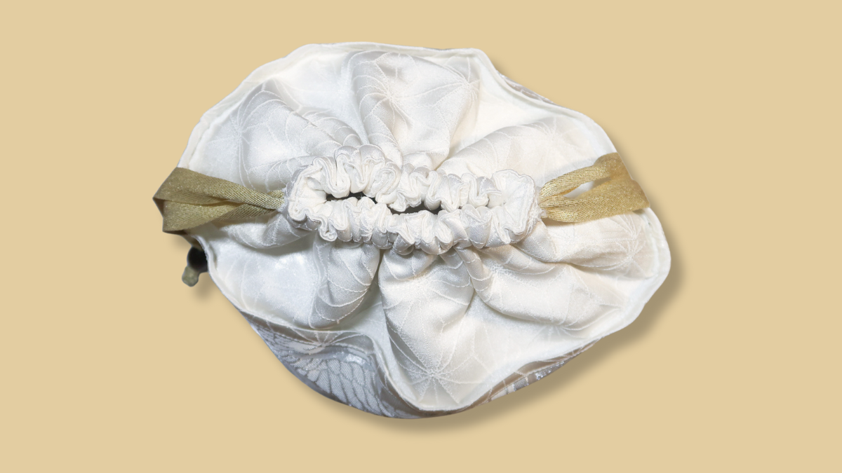 Comme toutes les créations d’Odile Van Den Woldenberg, ce pochon est fabriqué à partir d’anciens tissus japonais.