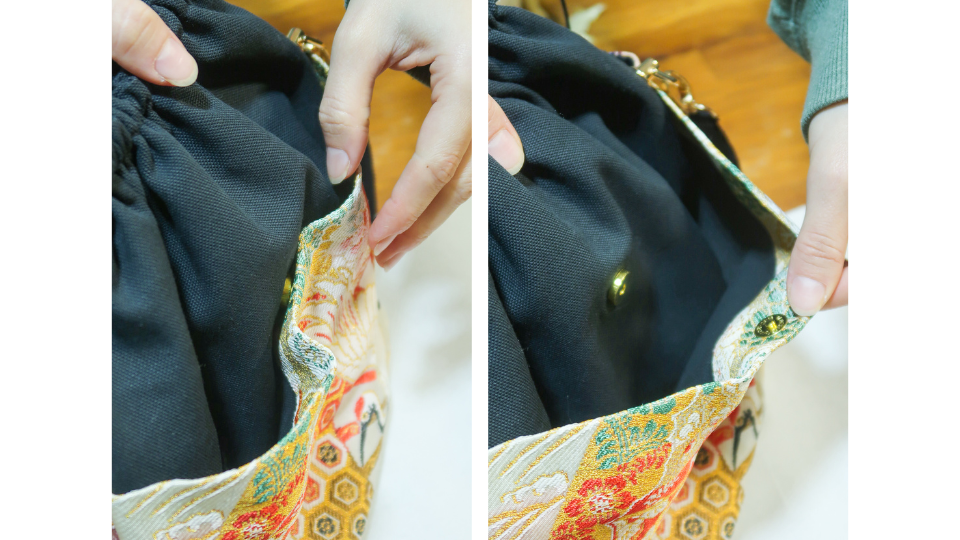 Comme toutes les créations d’Odile Van Den Woldenberg, ce sac à main est fabriqué à partir d’anciens tissus japonais.