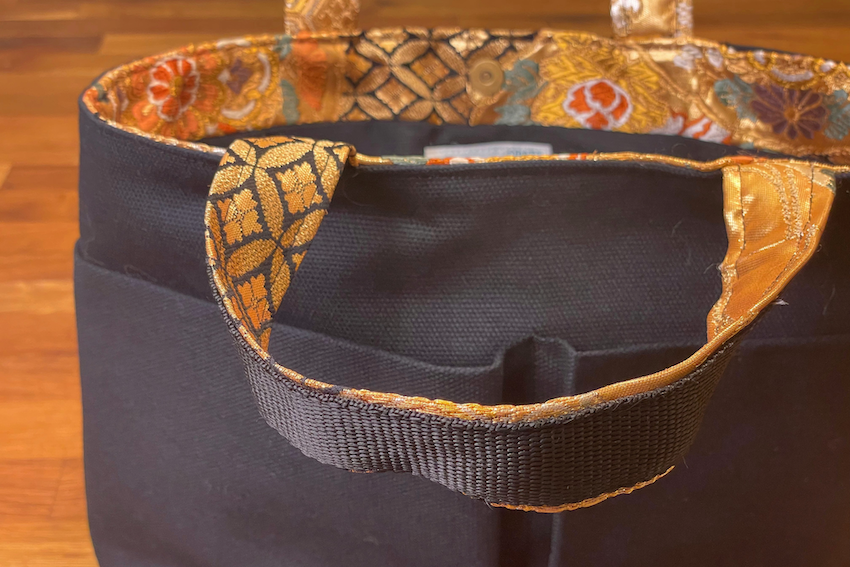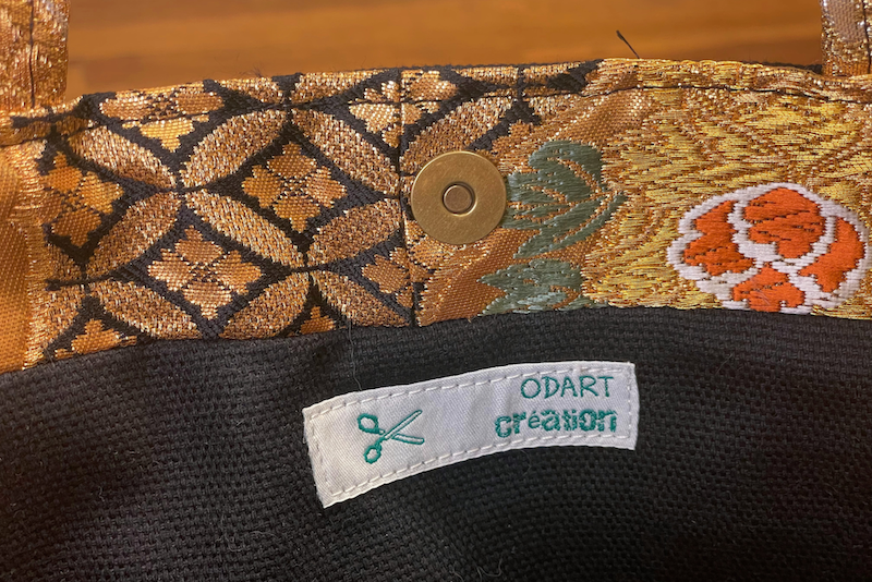 Comme toutes les créations d’Odile Van Den Woldenberg, ce sac à main est fabriqué à partir d’anciens tissus japonais.