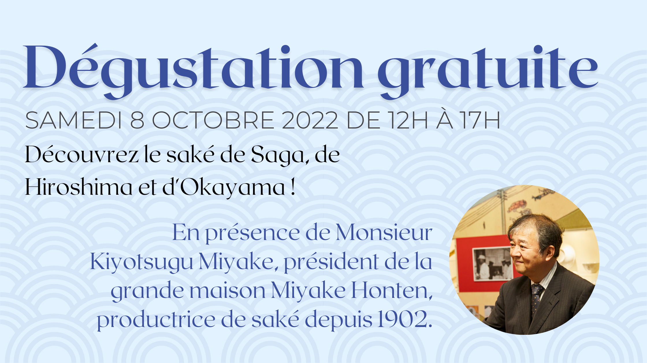 À cette occasion, nous accueillerons M. Kiyotsugu Miyake, président de la grande maison Miyake Honten de Hiroshima, productrice de saké depuis 1902.