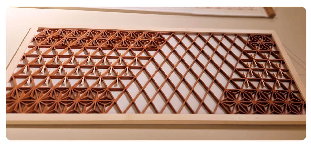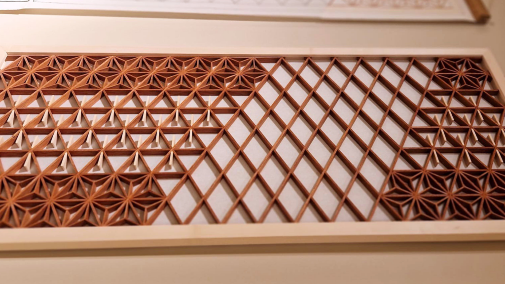 Le Kumiko (組子) est une technique ancestrale de menuiserie japonaise qui consiste à assembler des pièces de bois sans utiliser de clous ni de vis, pour créer des motifs géométriques complexes et élégants. C’est une technique qui remonte à plusieurs siècles ! En effet, le kumiko est né au Japon pendant la période Asuka (VIe-VIIIe siècle) et s’est perfectionné au fil des siècles. C’est une forme d’artisanat d’une grande précision, qui utilise uniquement du bois et repose sur l’ingéniosité de l’assemblage, ce qui en fait une méthode respectueuse de l’environnement.
