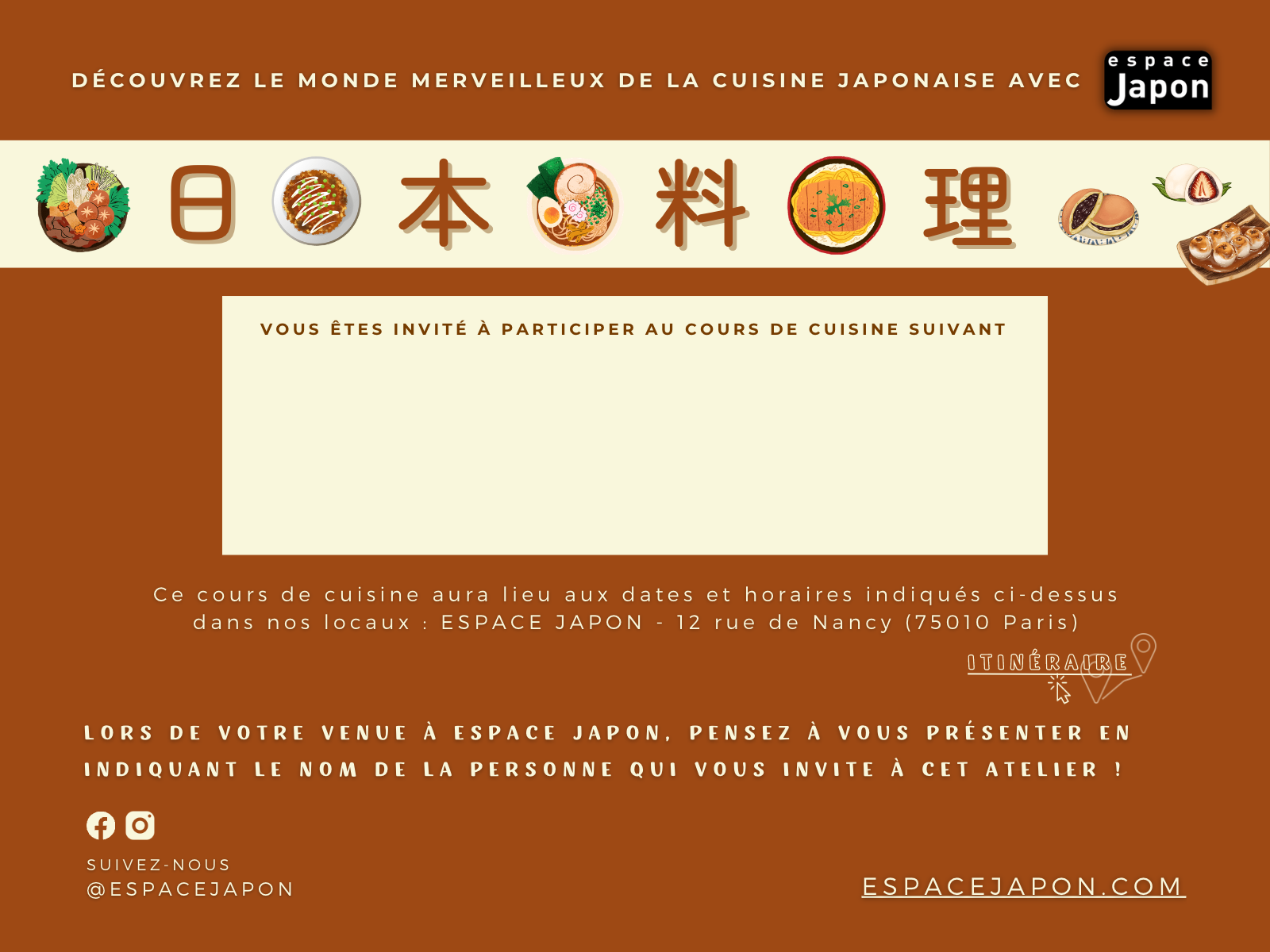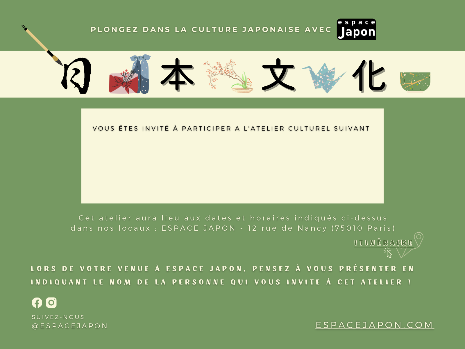 NB : L’envoi d’invitation est un service complémentaire vous permettant d’offrir l’atelier. Le nom lié à la réservation reste votre nom uniquement (nom du payeur de la commande). La personne invitée devra donc bien veiller à présenter à l’entrée de l’atelier le nom du payeur.
